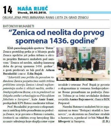 Priznanje „Nagrada Zenice“ pripalo je Odboru za međureligijsku saradnju Zenica,Klubu paraolimpijskih sportova Baton Zenica, prof. dr. Almi Mekić-Abazović, prof. Milenku Karoviću i prim. Dr. Elmiri Ljevaković. Nagrada dodijeljena Klubu paraolimpijskih sportova Baton obrazložena je izuzenim doprinosom ovog udruženja u resocijalizaciji…